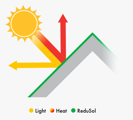ReduSol 是一種持久溫和的液體隔熱產品,可以讓保護建築物受到過多的太陽輻射。ReduSol 可以塗佈在玻璃、丙稀酸脂、聚碳酸脂、塑膠布、金屬表面和一般建築表面。ReduSol 最大的優勢在於可以被洗掉。您可以在季節開始時先塗佈一層薄的 ReduSol,在最熱的時候再塗佈上一層較厚的 ReduSol。在遮陽季節結束後使用 ReduClean 將 ReduSol 洗掉。Redusol 高度防水的特性可讓漆持續整個夏天,在 1:2 的比例下可阻擋到 78% 光。
